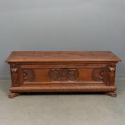 Notenhouten cassone met gesneden front, staand op klauwpoten, Italië, 17e/18e eeuw -oude houtwormgaatjes, stuk hout vervangen achteraan deksel-, 57 × 163 × 56 cm