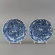 Paar Chinees porseleinen borden met blauw-wit drakendecor, 19e eeuw -randschilfers-, Ø 21,5 cm