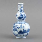 Chinees porseleinen kalebasvaas met blauw-wit decor van twee strijders, Transition -hals gerestaureerd-, hoogte 21 cm