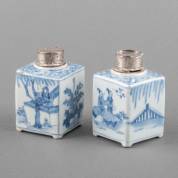 Twee vierkante Chinees porseleinen theebussen met blauw-wit decor: scène uit de Romance of the Western Chamber, Yongzheng -halzen defect en voorzien van latere zilveren deksels-, 10 × 6,5 × 6,5 cm