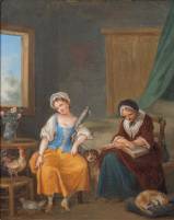 Schilderij: jonge spinster, olieverf op doek, niet gesigneerd, 18e eeuw -gaatje met verfverlies-, 40 × 32 cm