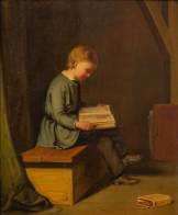 Hollandse School: lezend jongetje, olieverf op paneel, l.b. gesigneerd J? van Dijk, 30 × 24,5 cm