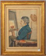 Hollandse School: portret van een schilder voor zijn ezel, aquarel, niet gesigneerd, 19e eeuw, 34 × 23,5 cm