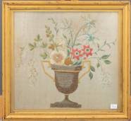 Ingelijst borduursel op zijde van vaas met bloemen, eind 18e/begin 19e eeuw -wat vlekken-, 29 × 32 cm
