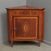 Mahonie hoekkastje of encoignure met ingelegde biezen en schelp in ruitvorm op de deur, Louis Seize-stijl, 19e eeuw -defecten-, 85,5 × 58 × 58 cm