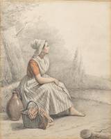 Elchanon Leonardus Verveer (1826-1900), zittende vrouw in landschap met kruik en mand aan haar voeten, potlood en roodbruin krijt op papier, l.o. gesigneerd en gedateerd 1845, 36 × 29 cm