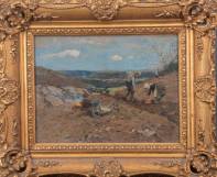 Hugo Mühlig (1854-1929), twee landarbeiders aan het werk in heuvellandschap, marouflé, r.o. gesigneerd, en gedateerd 5/5 15 -op later datum gemaroufleerd, doek niet helemaal recht-, 25 × 32 cm