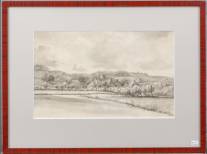 Hollandse School: gezicht op een dorpje tegen de duinen of een stuwwal, gewassen inkt op papier, niet gesigneerd, 19e eeuw, 21 × 34 cm