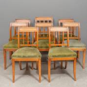 Zeven iepen stoelen en één armstoel met pijlvormige spijlen, bekleed met groen velours, circa 1800 -enkele oude houtwormgaatjes-, 87× 48 × 41 cm