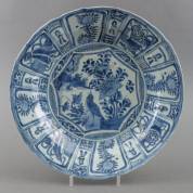 Chinese kraakporseleinen schotel met blauw-wit decor van vogel op rots, de rand met bloemen en kostbaarheden in vlakverdeling, Wanli -haarlijnen, randchips-, Ø 36,5 cm