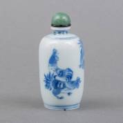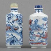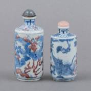 Twee Chinees porseleinen snuifflessen met blauw-wit en onderglazuur rood decor: de twaalf dieren uit de dierenriem, en een mythologische scène, beide Yongzheng gemerkt, 19e/20e eeuw, hoogste 10,5 cm roze dopje los van kurk