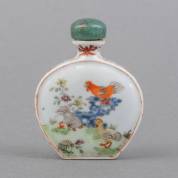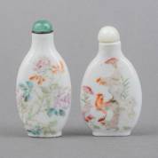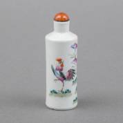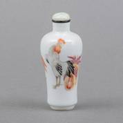 Twee Chinees porseleinen famille rose snuifflessen met hanendecors, 19e/20e eeuw -één met haarlijn aan de zijkant-, hoogte 8,5 cm