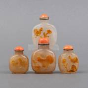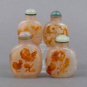 Vier Chinese agaten snuifflessen met hanendecor in reliëf, 19e/20e eeuw -enkele dopjes los en incompleet-, hoogste 9 cm