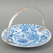 Chinees porseleinen dubbelbord met blauw-wit floraal decor, gemerkt met wierookbrander, Kangxi -chip-, voorzien van 2e gehalte zilveren hengsel met gravédecor, 1859, Ø 27,5 cm