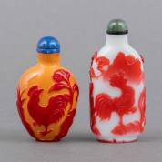 Twee Chinese cameoglazen snuifflessen met hanendecor, één in de kleur van neushoornvogel-ivoor, 19e/20e eeuw -één dopje los-, hoogste 7,3 cm