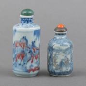 Twee Chinees porseleinen snuifflessen met blauw-wit en onderglazuur rood decor: de één met de acht paarden van Wang Mu, Yongzheng gemerkt, de ander met vier scènes met figuren en tekst, gemerkt, 19e/20e eeuw, hoogste 9,5 cm