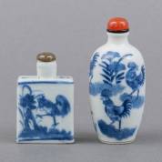 Twee Chinees porseleinen snuifflessen, waarvan één rechthoekig, met blauw-wit hanendecor, 19e eeuw, hoogste 9 cm