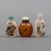 Drie Chinese glazen snuifflessen met achterglasschilderingen van onder andere hanen, 19e/20e eeuw -één dopje los-, hoogste 8,3 cm