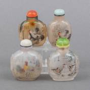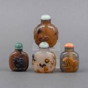 Vier Chinese natuurstenen snuifflessen, aan de binnenkant beschilderd met onder andere hanendecor, 20e eeuw -doppen incompleet-, hoogte 8 cm