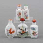 Vier Chinees porseleinen famille rose snuifflessen met diverse decors: twaalf dieren uit de dierenriem, zotjes en hanen, drie gemerkt, 19e eeuw -enkele doppen los of incompleet-, hoogste 7 cm