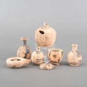 Zes stuks archeologisch aardewerk: vier kruikjes, pyxis en olielampje, alle vermoedelijk Zuid-Italië, hellenistische periode, grootste 8 × Ø 5 cm, herkomst: privécollectie oud-directeur Museum Kam, Nijmegen