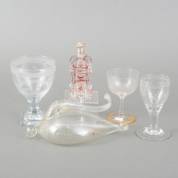 Vijf stuks glaswerk: geslepen kristallen odeurflacon met rood überfangdecor en zilveren dop, 19e eeuw, drie geslepen gelegenheidsglazen: één met decor landhuizen en hond waarboven een opschrift 'Marque D'Amitié, eerste kwart 19e eeuw -schilfertje van voet-, één met bloemdecor en gouden band om voet, deze band met inscriptie '10 julij 1813-1823', en één met bloemdecor en inscriptie 'B.D.S., en donderglas, 19e eeuw, die laatste hoogte 21 cm