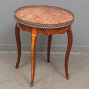 Lage mahonie en rozenhouten bijzettafel met marmeren blad en messing galerierand met opengewerkte harten, 56 × Ø 50 cm