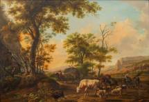Omgeving Balthasar Paul Ommeganck (1755-1826), landschap met herders en een os, olieverf op paneel, niet gesigneerd -beetje vuil, twee chipjes uit de verflaag-, 44 × 64 cm