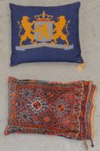 Perzisch soumakkussen Shahsevan -oude mottenschade achterop-, en geborduurd wollen kussen met het Nederlandse wapen, soumakkussen 57 × 40 cm