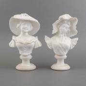 Twee albasten bustes van dames met hoed, 19e/20e eeuw -defecten-, hoogte 29 cm