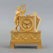 Vergulde bronzen pendule met allegorie op de muziek: lierspeler, toorts en harp, adres: Pons à St. Nicolas, Rouen, Frankrijk, 19e eeuw -achterplaat ontbreekt, schroef opwindgat afgebroken, inclusief slinger en sleutel-, 27 × 19,5 × 7 cm