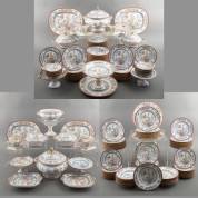 Uitgebreid aardewerk servies, decor Dresden, uitvoering Pinder Bourne & Co., Engeland, derde kwart 19e eeuw, bestaande uit: 76 dinerborden Ø 23,5 cm, 18 diepe borden Ø 23 cm, 35 ontbijtborden Ø 20 cm, 10 kleine schaaltjes Ø 14,5 cm, bedekte soepterrine, twee bedekte terrines, twee saucières, drie tazza's, twee ronde serveerschalen, twee rechthoekige serveerschalen, twee kleine serveerschalen, en slaschaal -veel serviesdelen beboterd, enkele chips-