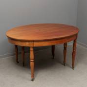 Ovale mahonie coulissetafel met ingelegde bies, de gedraaide poten met zwenkwieltjes, 19e eeuw, met zes ongelakte en twee gelakte tussenbladen, 75 × 142 × 110 cm