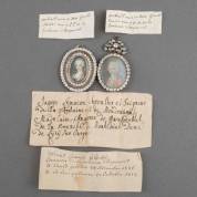 Paar miniatuurportretten, uitgevoerd als metalen hanger gezet met gefacetteerd kristal, vergezeld van vier handgeschreven briefjes: 'Portrait van de overgrootmoeder / overgrootvaader van J.C.C. de la Fontaine d'Orgemont' en 'Volraat, Caarel Lebecht, Lemacon de la Fontaine d'Orgemont, te Venlo geboore 28 November 1736, te Arnhem gestorven 24 Octoober 1773', 6 × 4,5 en 6,5 × 4 cm