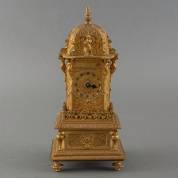 Torenvormig verguld bronzen tafelklokje met rijk reliëfdecor, het uurwerk met adres: Raingo Freres, Parijs, eind 19e eeuw -minutenwijzer ontbreekt, uurwerk defect-, 25 × 11,7 × 9,8 cm