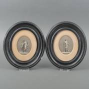 Paar gravures met figuren uit de klassieke oudheid, in ovale zwarte lijsten, 12 × 9 cm