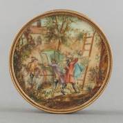 Ronde vernis Martin snuifdoos, het deksel met beschilderd decor van vluchtende geliefdes, 18e/19e eeuw, Ø 9 cm