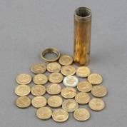 Messing cilindervormig cachet met 25 verwisselbare dubbelzijdige zegels, ieder met een gegraveerd symbool en Franstalige spreuken, aan onderzijde gemerkt 'No 424, Leveque, Graveur Palais Royal', 19e eeuw, 7,5 × Ø 1,8 cm -compleet-