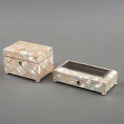 Parelmoerbelijmd theedoosje met binnendeksel, en lepeldoosje met facetgeslepen glazen deksel, 19e eeuw -theekistje met wat restauraties, geen sleuteltjes-, theekistje 8 × 11 × 8 cm