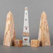 Paar beige onyx obelisken, paar onyx kubussen met gefacetteerde randen -oppervlaktekrasjes-, en een porseleinen polychrome obelisk met het wapen van Nederland en opschrift 'Je maintiendrai', onderop gestempeld Het Loo 1994, laatstgenoemde 31,5 × 8 × 8 cm
