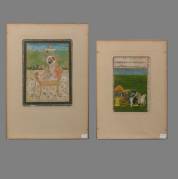 Twee Indiase miniatuurschilderingen: heerser op troon -matige staat, vele lacunes en scheurtjes-, 20,5 × 15,5 cm, en heerser met gevolg onderweg -craquelures in verflaag-, 15 × 9,5 cm