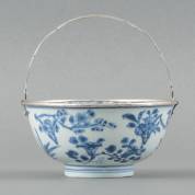 Chinees porseleinen kom met blauw-wit floraal decor, gemerkt, 17e eeuw, voorzien van 2e gehalte zilveren hengsel en montuur, 7,5 × Ø 15 cm