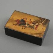 Russische lakwerk doos, het deksel beschilderd met winters tafereel van trojka, de binnenzijde met zegels en annotatie, 'voor Vishnyakovo', Fedoskino, laat 19e eeuw -deksel gecraqueleerd, gebruikssporen-, 4 × 12,5 × 8,5 cm