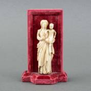 Olifantsivoren beeld: Madonna met Kind, Frankrijk, 17e eeuw, op rood velours achterwandje -kroon ontbreekt, hoofd en arm Christus gelijmd, krimpscheuren, chipje van mantel op de rug, CITES EU-certificaat bijgevoegd, geen uitvoer buiten de EU-, 9,5 × 4 × 1,5 cm