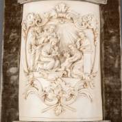 Olifantsivoren gesneden halfrond reliëf: de Heilige Familie in cartouche, versierd met voluten, Dieppe, Frankrijk, 19e eeuw, in montuur bekleed met groen velours -kleine krimpscheurtjes, CITES EU-certificaat bijgevoegd, geen uitvoer buiten de EU-, 20 × 14 × 3,5 cm