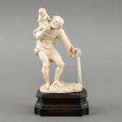 Olifantsivoren beeld: de Heilige Christoffel met Christus op zijn rug, Zuid-Duitsland, 17e/18e eeuw, op los gezwart houten basement -hand en stok gebroken en gelijmd, krimpscheuren, CITES EU-certificaat bijgevoegd, geen uitvoer buiten de EU-, 16 × 10 × 5,5 cm