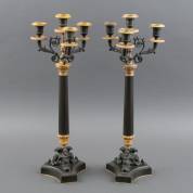 Paar gepatineerde bronzen vierlichts kandelaars, op driehoekig basement, Charles Dix-stijl, circa 1900 -patina beetje sleets-, 57 × 20 × 18 cm