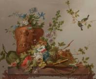 Toegeschreven aan Gerke Jans de Jager (1742-1822), supraporte: bloemstilleven met fluit, terracotta pot met puttidecor en koolmeesjes, niet gesigneerd, circa 1770-1790 -gedoubleerd en gerestaureerd-, lijst 130 × 140 cm