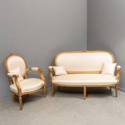 Verguld houten bankje en armstoel, beide met crèmewitte satijnen bekleding, 19e eeuw, inclusief drie kussentjes -bekleding armkussentjes sleets, lichte slijtage aan bekleding op achterkant bank en linksboven aan zitting-, bank 160 cm breed