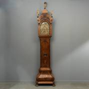 Amsterdams staand horloge in wortelnotengefineerde kast, met secondewijzer, datumaanduiding, maanstand en speelwerk van zes melodieën op vijftien bellen, inclusief sleutel, slinger en drie gewichten, gesigneerd Paulus Bramer, Amsterdam, circa 1760 -fineerschade, wijzerplaat met vlekken-, hoogte zonder beelden 277 × 71 × 83 cm